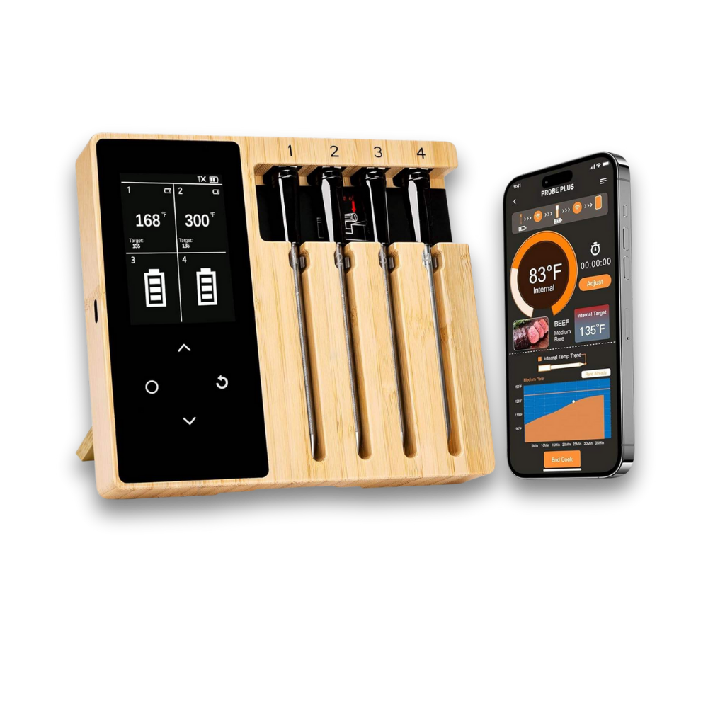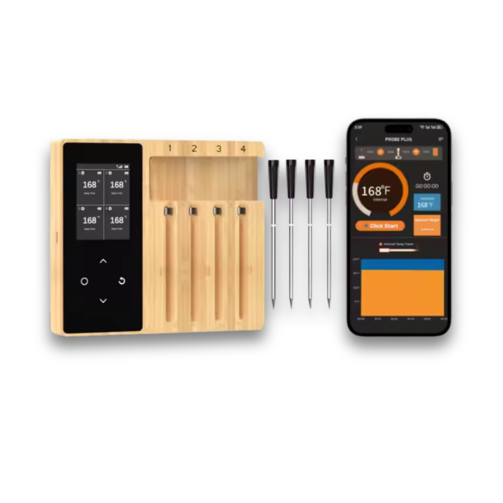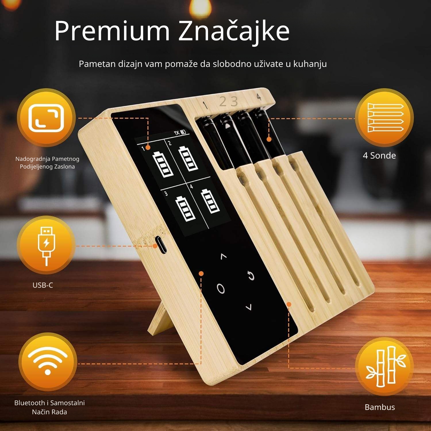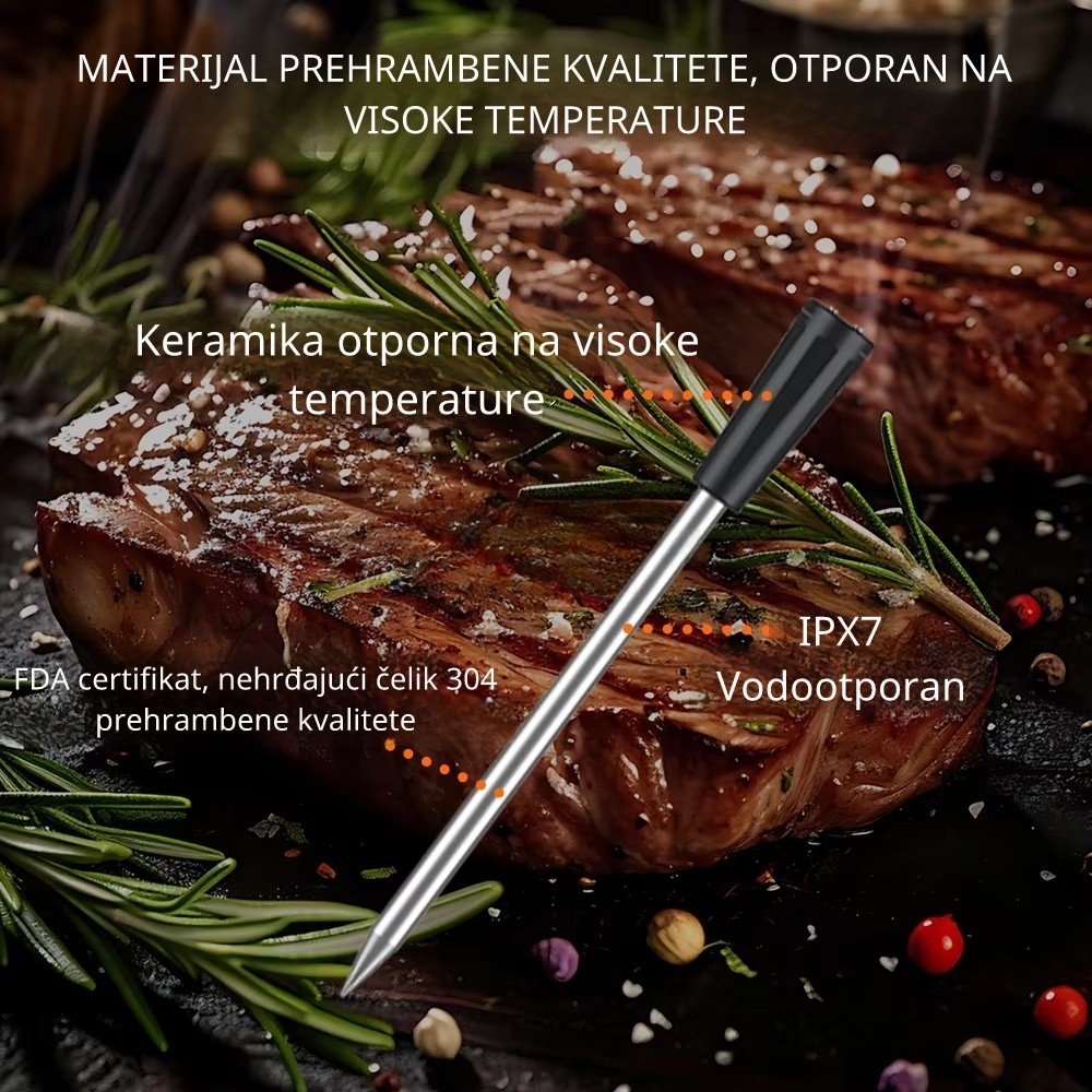 Uz 4 sonde možete znati kako je pečeni svaki dio vašeg većeg komada mesa ili više različitih komada mesa na roštilju. Pametni bežični termometar za meso ima Bluetooth povezivost i kompatibilnost s aplikacijom PROBE PLUS (iOS i Android). Namijenjen je preciznom praćenju unutarnje temperature hrane tijekom pečenja, roštiljanja, BBQ-a, dimljenja ili kuhanja u pećnici. Termometar ima širok raspon mjerenja, visoku točnost, izdržljivu sondu od nehrđajućeg čelika i dugotrajnu bateriju, a signal se prenosi preko bežične stanice (repeater).