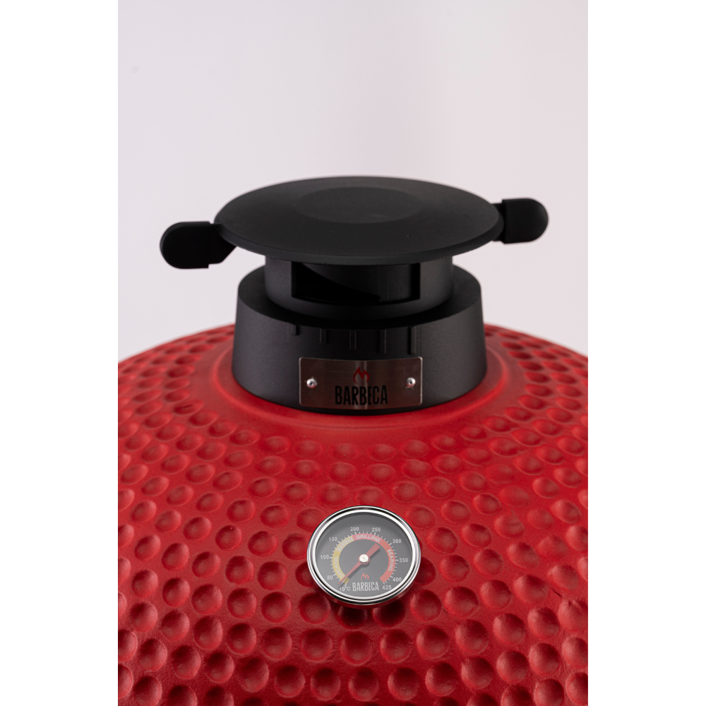Barbeca 21″ Lux Bubble Glaze kamado ima poseban premaz koji mu daje interesantan mat izgled u antracit, crvenoj i zelenoj boji, vodootpornu aluminijsku gornju rozetu i šarku za podizanje poklopca sa zračnim sustavom što omogućava lakše spuštanje i otvaranje poklopca te kopču koja drži poklopac zatvorenim, a otvara se tek pritiskom na kopču.